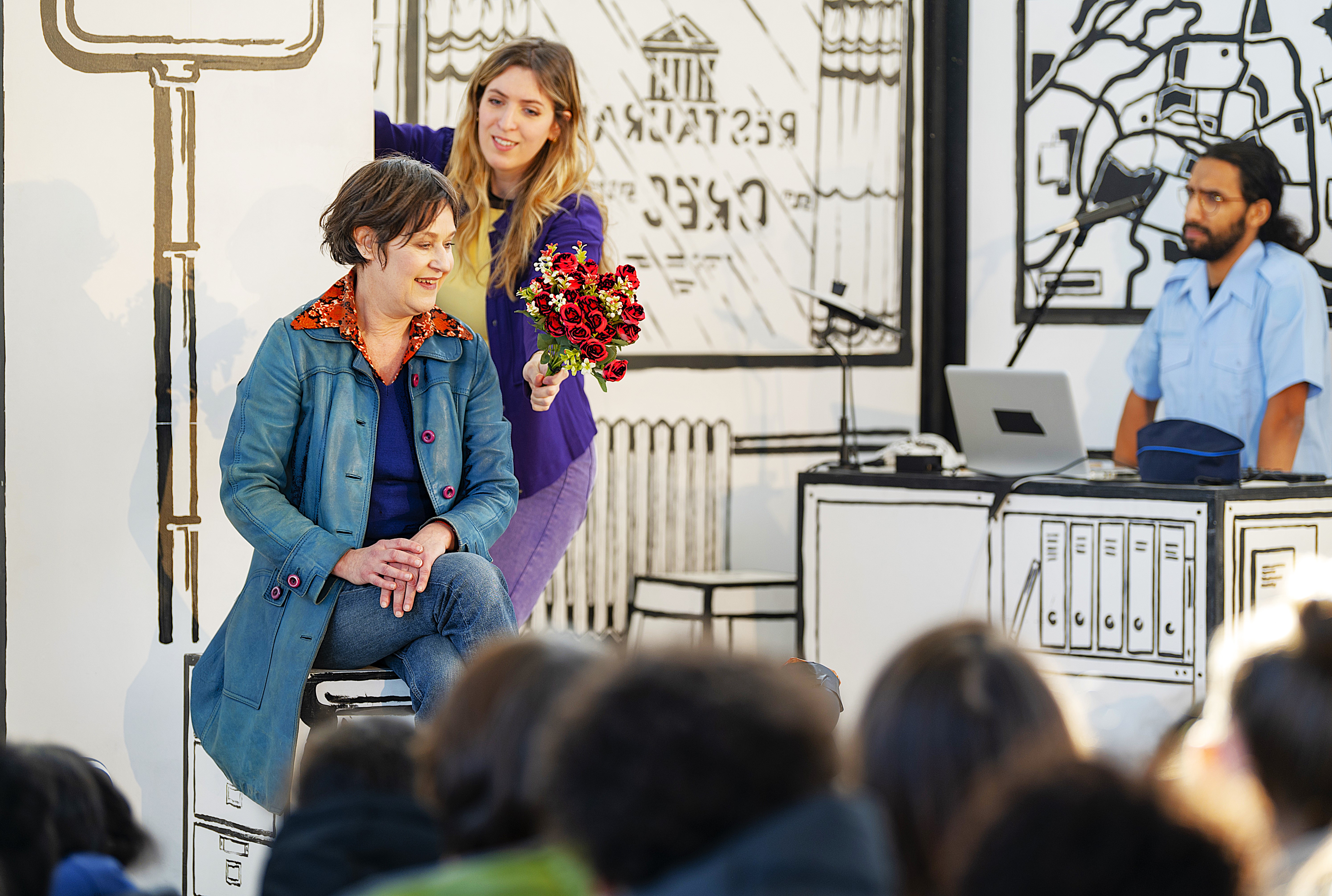 L’écriture vive s’inspire explicitement de la BD. Telle une vraie boîte à surprises, le décor, entièrement dessiné en noir et blanc, se transforme en différents espaces d’où sortent les corps des deux comédiennes. Tout est ainsi « bricolé » à vue pour (se) jouer de l’illusion théâtrale.